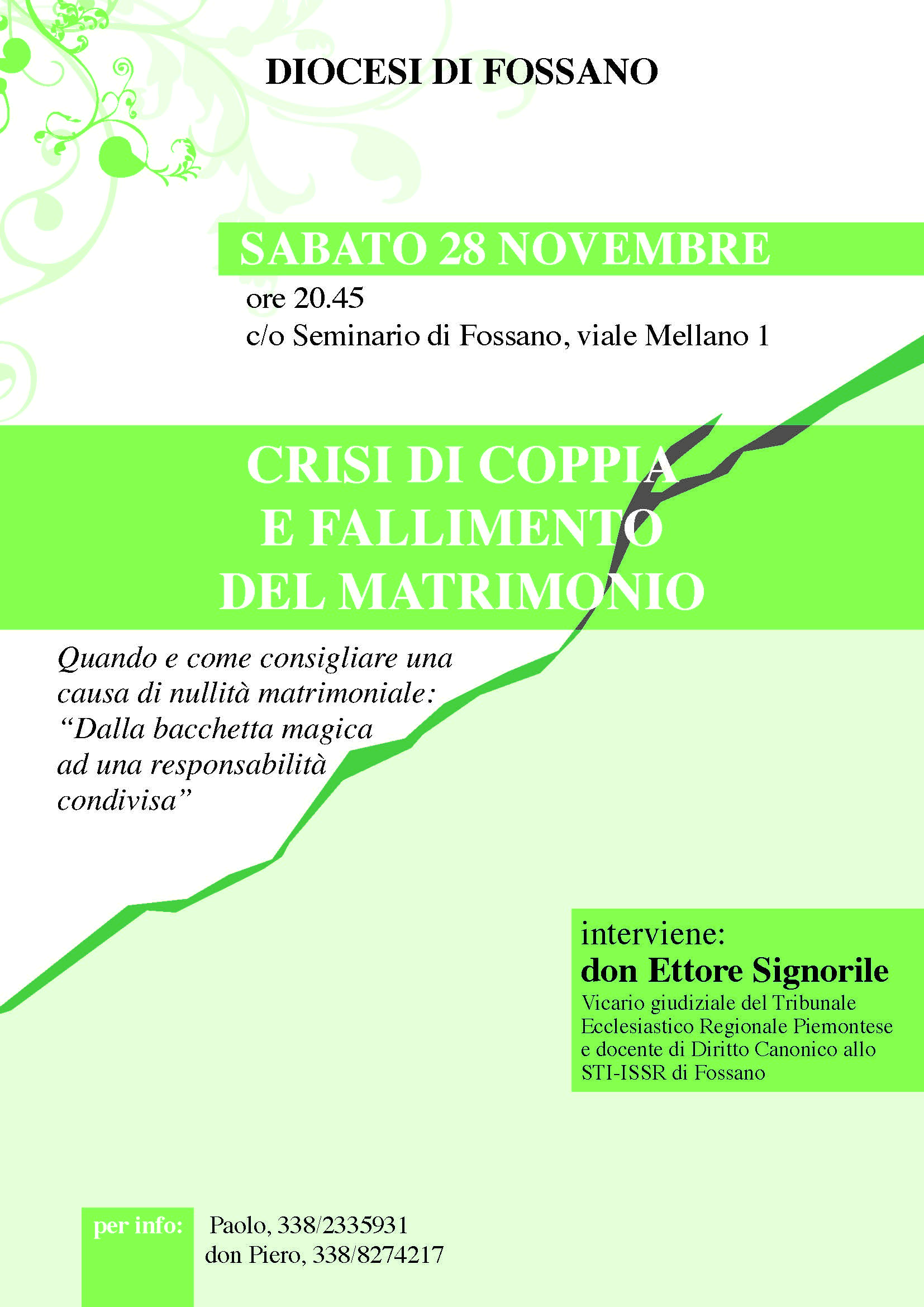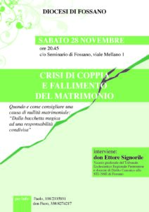 “Crisi di coppia e fallimento del matrimonio: quando e come consigliare una causa di nullità matrimoniale: “Dalla bacchetta magica ad una responsabilità condivisa””; è l’argomento che verrà trattato sabato 28 novembre ore 20.45 presso l’Aula Magna del Seminario di Fossano (viale Mellano, 1), da don Ettore Signorile, Vicario giudiziale del Tribunale Ecclesiastico Regionale Piemontese, e docente di Diritto Canonico allo STI-ISSR di Fossano, il quale affronterà il profilo canonico e giuridico annesso alle problematiche che separati, divorziati e risposati si trovano fra mano.