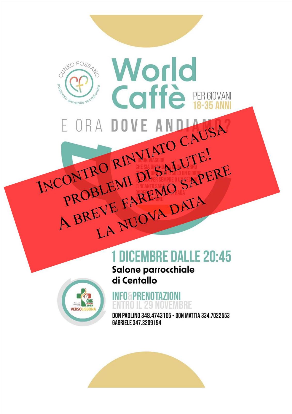 Viene rinviato il World Caffè in programma per giovedì 1 dicembre alle 20.45 nel salone parrocchiale di Centallo. La nuova data del secondo incontro verrà comunicata più avanti, probabilmente sarà nel mese di gennaio. L’appuntamento dedicato ai giovani dai 18 ai 35 anni, promosso dagli Incaricati diocesani per la Pastorale giovanile e per la Pastorale delle vocazioni di Cuneo e di Fossano, riflette sul tema del partire insieme a Gabriele Galli e Anna Gasparini, due giovani ragazzi che nel mese di febbraio partiranno per un’esperienza missionaria di tre anni in Brasile.