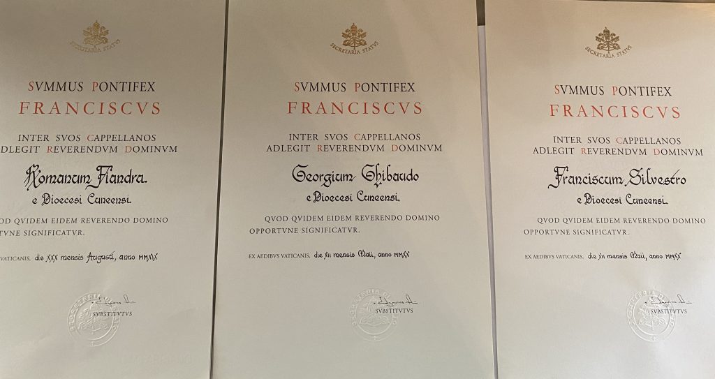Hanno servito per diversi decenni una medesima parrocchia, creando tre case di riposo che ancora oggi sono strutture preziose per gli anziani delle nostre famiglie: per questo motivo papa Francesco, su richiesta del Vescovo Piero Delbosco, ha conferito il titolo di Cappellano di sua Santità a don Giorgio Ghibaudo, 94 anni, dal 2002 parroco emerito del Cuore Immacolato di Maria in Cuneo, don Francesco Silvestro, 92 anni, dal 2015 parroco emerito di San Nicolao in Vernante e don Romano Fiandra, 84 anni, dal 2015 parroco emerito di San Pietro in Limone Piemonte e attualmente Amministratore parrocchiale di Roaschia.