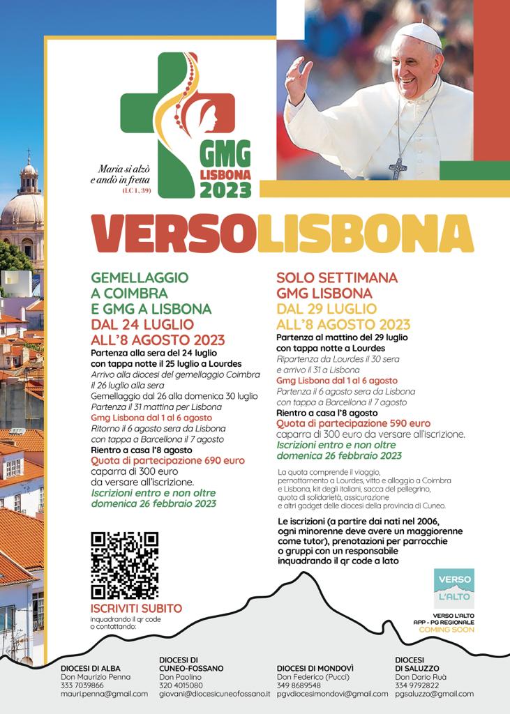 Per ricevere le iscrizioni per la Giornata mondiale della Gioventù a Lisbona l'Ufficio per la Pastorale giovanile è aperto a Cuneo, nel Vescovado nuovo, via Amedeo Rossi 28, tutti i giovedì mattina.