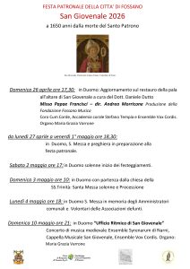 domenica 3 maggio ore 9,45 con la celebrazione della Solennità di San Giovenale con la S. Messa presieduta da S.E.R. Mons. Celestino Migliore, Nunzio apostolico a Parigi, e da S.E.R. Mons. Piero Delbosco Vescovo di Cuneo-Fossano con la processione per le vie della città,