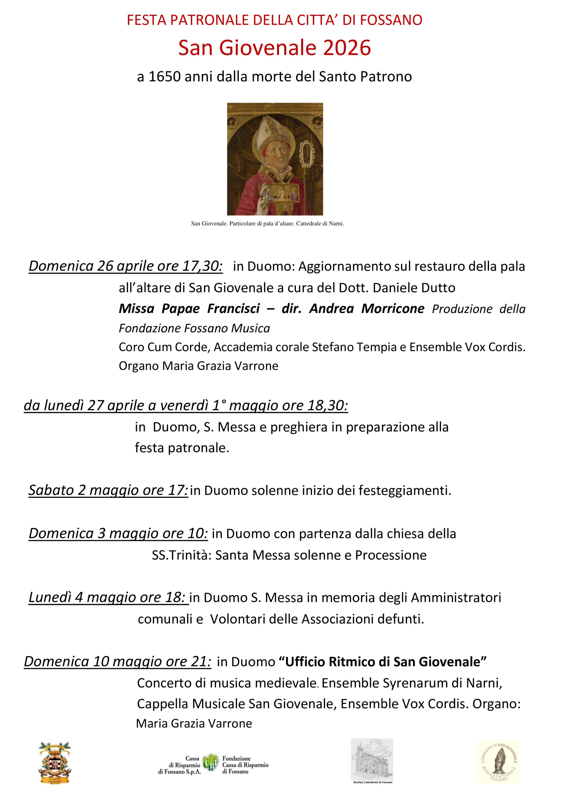 Come ogni anno la comunità fossanese si appresta festeggiare il Santo Patrono Giovenale. Il 2026 ci invita a fare memoria del suo transito avvenuto nel 376 a Narni, sono quindi 1650 anni dalla sua morte. La città di Fossano lo accolse nel lontano 1279 e forse già il 5 maggio 1314 si celebrò per la prima volta la festa di San Giovenale. La tradizione della festa patronale in città si è perpetuata nel tempo grazie alla devozione e all’impegno della popolazione locale che in passato portava in città moltissime persone provenienti anche dalle vallate alpine. Oggi siamo chiamati a perseverare nel solco tracciato dai nostri nonni e genitori per continuare a proporre ai fossanesi la figura di Giovenale come protettore della città.