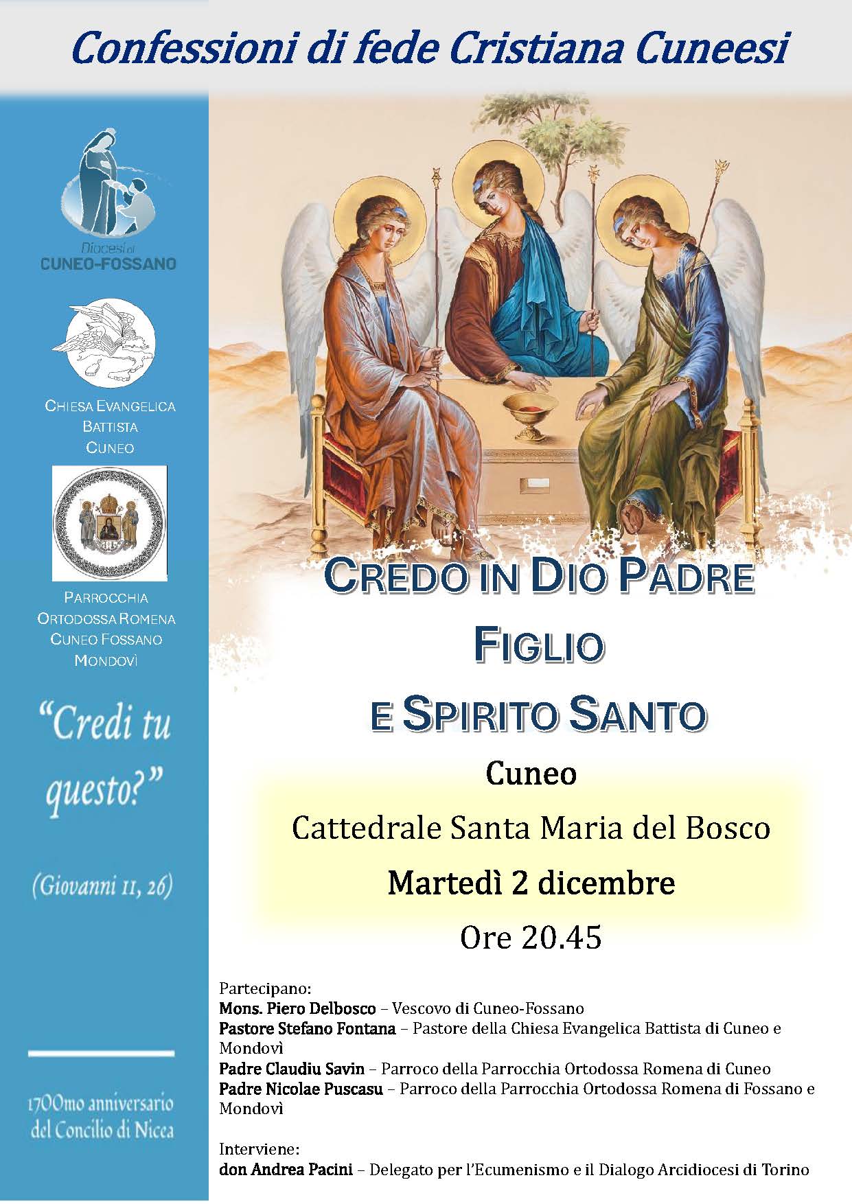 Martedì 2 dicembre alle 20,45 ci sarà l’ultimo appuntamento di questo percorso, una Celebrazione Ecumenica alla quale parteciperanno il nostro Vescovo, Mons. Piero Delbosco, il Pastore della Chiesa Evangelica Battista di Cuneo Stefano Fontana e padre Claudiu Savin e Nicolae Puscasu, rispettivamente parroci ortodossi romeni di Cuneo e di Fossano. Momento centrale della Celebrazione sarà la recita del Credo Niceno-Costantinopolitano. Interverrà don Andrea Pacini, della Diocesi di Torino, teologo molto impegnato nel dialogo ecumenico ed interreligioso.