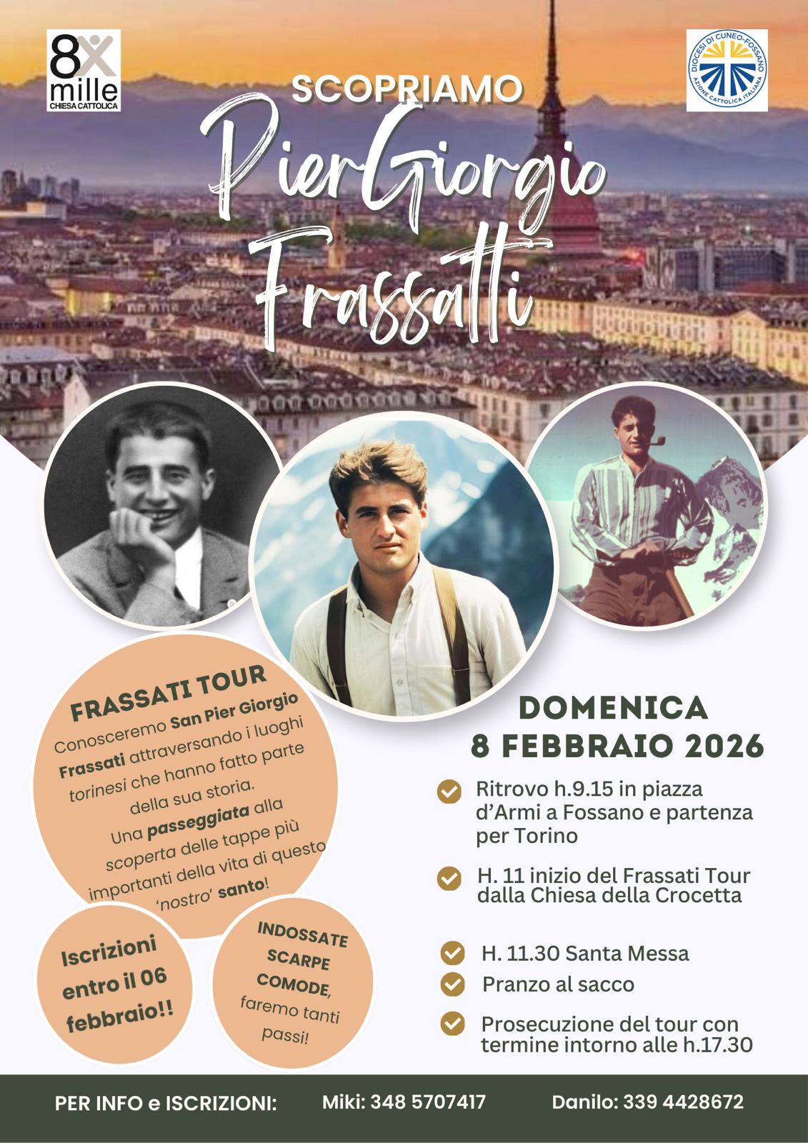 L’equipe adulti di Azione Cattolia della Diocesi Cuneo-Fossano organizza per domenica 8 febbraio la visita al Frassati Tour, una camminata tra i luoghi fulcro della storia di Pier Giorgio , per scoprirne vita ed opere nella cornice della sua città natale, Torino. Il ritrovo sarà alle ore 9.15 in piazza d’Armi a Fossano con rientro verso le 18.30/19, per assaporare una giornata aperta a tutti, adulti, giovani e piccini, all’insegna dello stare insieme conoscendo a fondo la preziosità di Pier Giorgio Frassati.